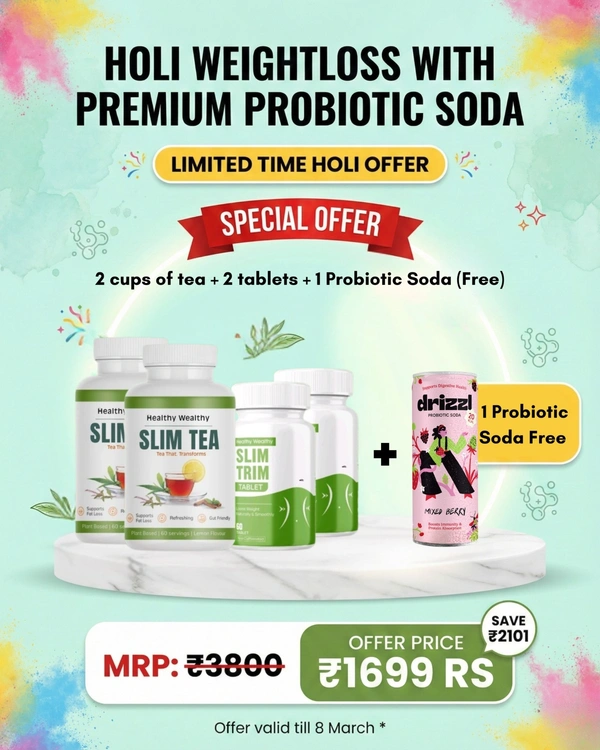 Holi celebrations ke baad weight gain aur bloating common hai. Isliye hum lekar aaye hain Holi Special Weightloss Combo, jo aapko metabolism support, cravings control aur digestion improvement mein help karta hai. Is combo ke saath aapko milta hai 1 Premium Probiotic Soda FREE jo gut health aur digestion ko support karta hai.
