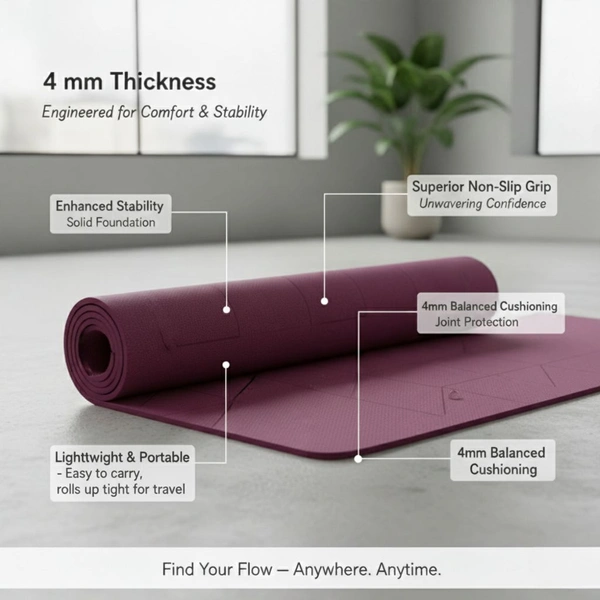 A yoga mat is a specially designed mat that provides grip, cushioning, and stability for yoga, stretching, meditation, and workouts. It creates a safe, non-slip surface that protects your joints and prevents injuries during poses or exercises. Good yoga mats are lightweight, easy to clean, and durable, making them perfect for home practice, gym sessions, or outdoor workouts. Available in different materials (like PVC, TPE, or natural rubber) and thicknesses, a yoga mat supports better balance, comfort, and focus so you can move freely and stay grounded in every session.
